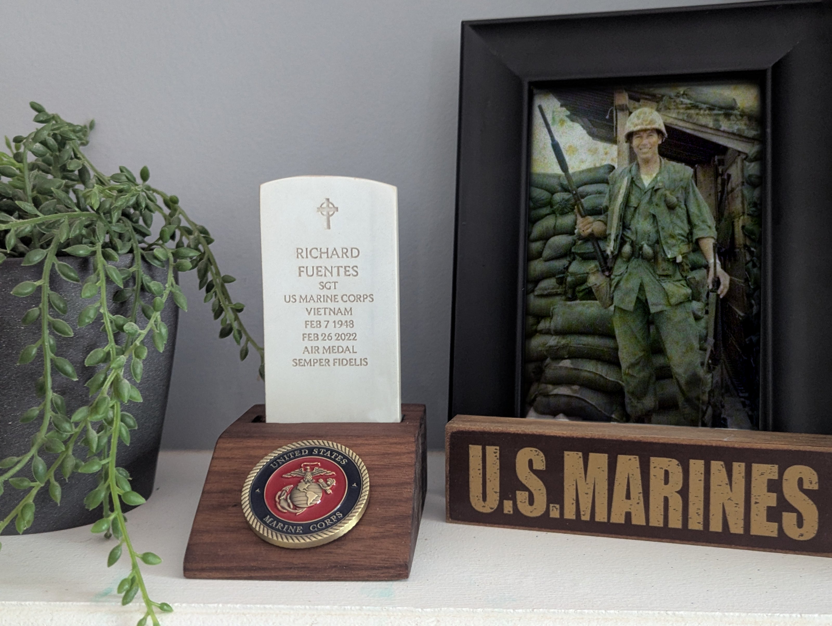 A service coin honoring their specific branch is placed on the wooden stand—a proud tribute to their service.